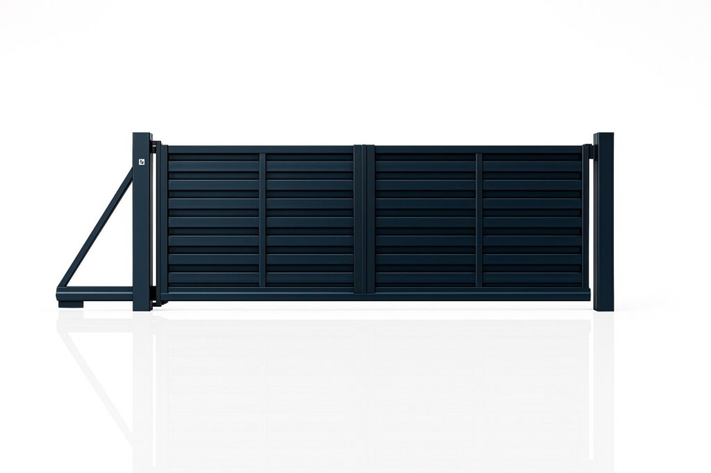 Moderne skydeport i aluminium, pulverlakeret, sort. Højde på 150 cm. Stolper ikke inkluderet.